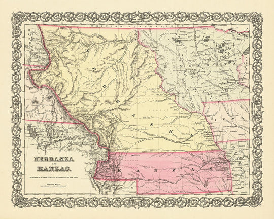 Tauchen Sie mit dieser äußerst detaillierten alten Karte von Nebraska und Kansas aus dem Jahr 1856 in das reiche Geflecht der amerikanischen Geschichte ein. Diese Karte wurde vom renommierten Kartographen JH Colton angefertigt, der weithin als der beste amerikanische Kartograph seiner Zeit gilt, und bietet einen einzigartigen Einblick in die Frühzeit Tage dieser Gebiete, eine Zeit, als sich die Vereinigten Staaten noch in den Gründungsjahren befanden. Die Karte zeigt die sorgfältige Handwerkskunst und die Liebe zum Detail, die Coltons Arbeit auszeichnen, und ist ein Beweis für den unbezähmbaren Forscher- und Entdeckungsgeist, der diese Epoche geprägt hat.