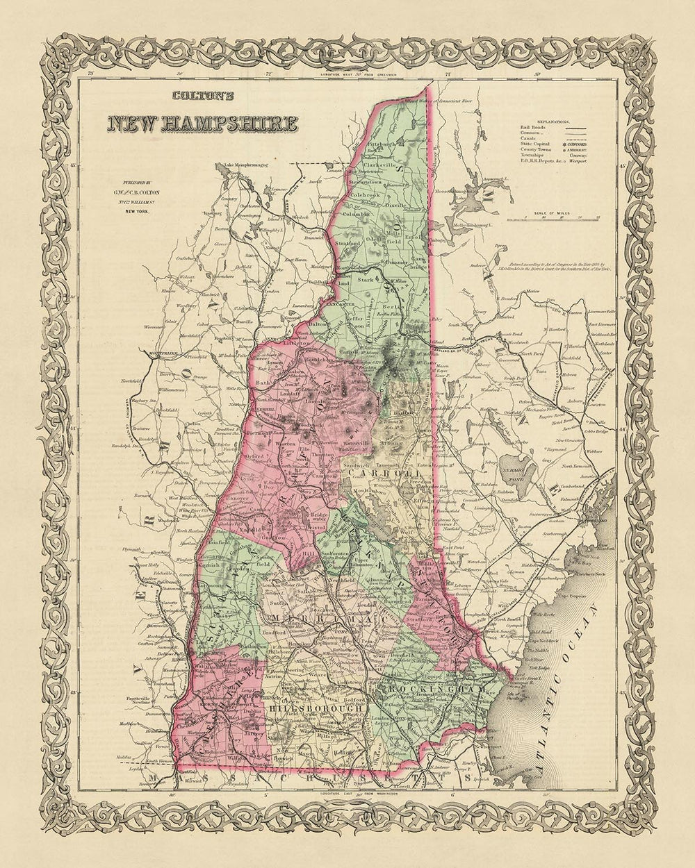 Tauchen Sie ein in die faszinierende Vergangenheit der Vereinigten Staaten mit dieser exquisiten alten Karte von New Hampshire, die 1855 vom angesehenen Kartenmacher JH Colton sorgfältig angefertigt wurde. Diese Karte ist ein Beweis für die sorgfältige Handwerkskunst und die hervorragende Qualität, für die Colton bekannt war und die ihn zu einem solchen machte einer der angesehensten amerikanischen Kartographen seiner Zeit. Diese Karte ist eine wunderschöne Mischung aus Kunst und Geschichte und bietet einen einzigartigen Einblick in die frühe Entwicklung von New Hampshire, eine Zeit, als viele seiner Siedlungen gerade erst Gestalt annahmen.