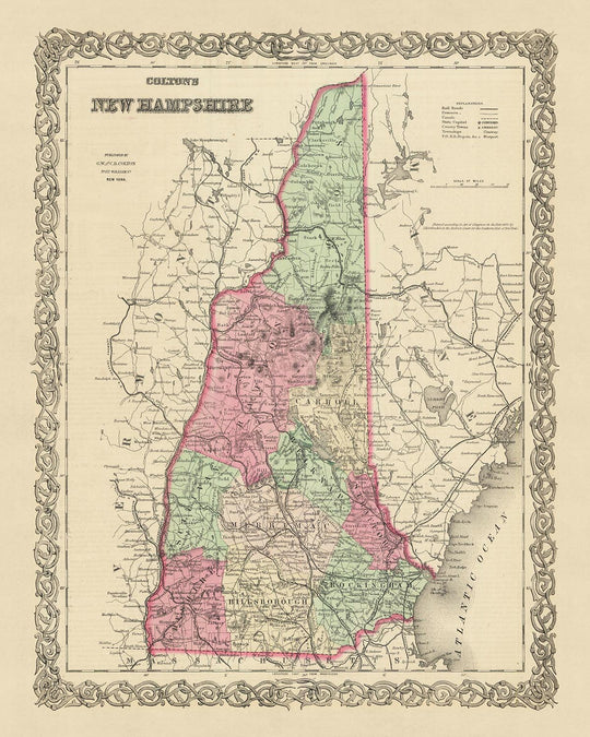 Diese alte Karte von New Hampshire von JH Colton ist mehr als nur ein Stück Geschichte; Es ist ein Kunstwerk, das eine Geschichte erzählt. Es ist ein Beweis für die Vision und das Können eines der besten Kartographen Amerikas und eine greifbare Verbindung zur Vergangenheit. Diese Karte ist eine perfekte Ergänzung für jede Sammlung, ein Gesprächsstarter und ein Stück Americana, das kommende Generationen faszinieren und inspirieren wird.