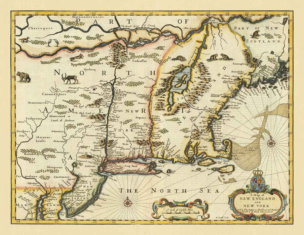 Diese Karte wurde ursprünglich zu einer sehr interessanten Zeit für britische Interessen in der Neuen Welt veröffentlicht: Das Britische Empire hatte gerade Neu-Amsterdam von den Niederländern erobert und es 1664 in New York umbenannt. Dies war eine der ersten Karten der britischen Kolonien in Nordamerika, die in Atlanten in der alten Welt veröffentlicht wurden - und damals waren Karten und die darauf gezogenen Grenzen politisch sehr bedeutend.