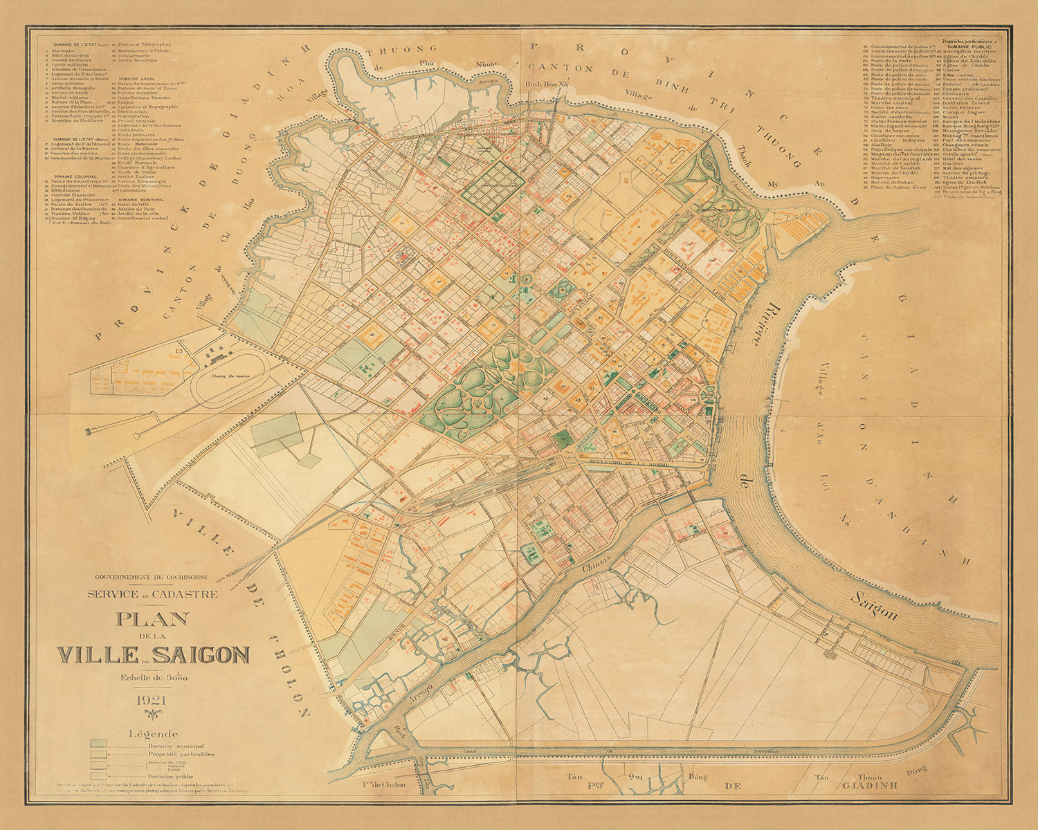 Cadastre de Cochinchine, der Herausgeber der Karte, war eine französische koloniale Vermessungs- und Kartierungsbehörde, die 1861 gegründet wurde. Die Behörde spielte eine entscheidende Rolle bei der Dokumentation und Kartierung der französischen Territorien in Vietnam und trug erheblich zum Verständnis der Geographie und städtischen Entwicklung der Region bei. Diese Karte ist ein bemerkenswertes Beispiel für ihre kartografische Expertise und Detailgenauigkeit.
