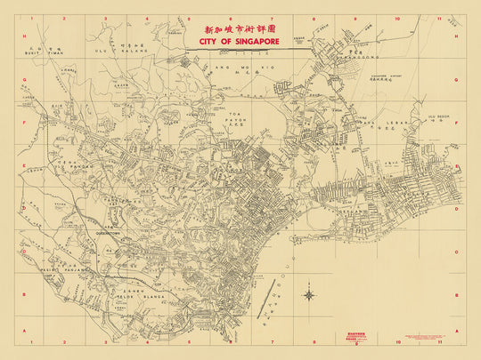 Die 'Detaillierte Straßenkarte von Singapur Stadt', ursprünglich 1955 vom Singapore Improvement Trust veröffentlicht, ist ein exquisit gestaltetes Stück Kartographie, das das Wesen von Singapur Stadt in einer entscheidenden Ära seiner Geschichte einfängt. Diese Straßenkarte erstreckt sich bis an die Ränder der Stadt, einschließlich Gebieten wie Bukit Timah, Saranggong, Ulu Kalang und Ang Mo Kio, und bietet einen umfassenden Blick auf die Region. Sie illustriert akribisch die Malayan Railway Line, Uferstraßen, Hauptstraßen, Wohnsiedlungen, Parks, Schulen und Hochschulen, Regierungsgebäude, Fabriken, Clubs, das Fußballstadion, Tempel, Friedhöfe und andere Sehenswürdigkeiten. Dieses Maß an Detail macht sie zu einer faszinierenden Studie für diejenigen, die sich für die städtische Gestaltung und Infrastruktur des mittleren 20. Jahrhunderts in Singapur interessieren.