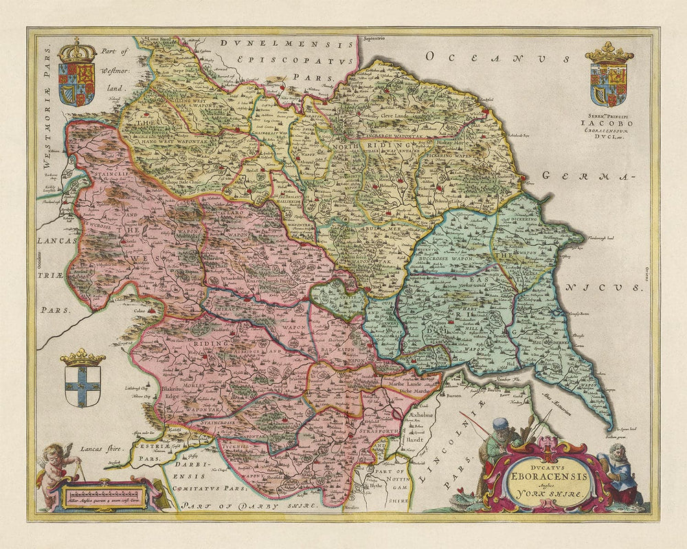 Dies ist eine äußerst seltene, alte farbige Karte von Yorkshire, die von dem Meisterkartenmacher Joan Blaeu aus seiner Werkstatt in Amsterdam erstellt und ursprünglich 1654 in diesem Theatrum Orbis Terrarum Sive Atlas Novus veröffentlicht wurde.