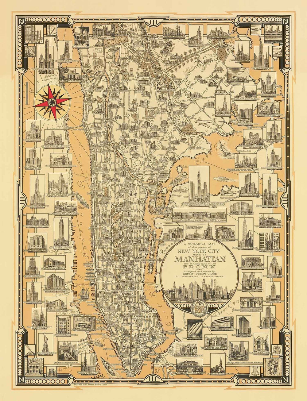 Alter Piktorialer Stadtplan von Manhattan & der Bronx, 1939 von E. Chase: Wahrzeichen, Wolkenkratzer, Hudson River