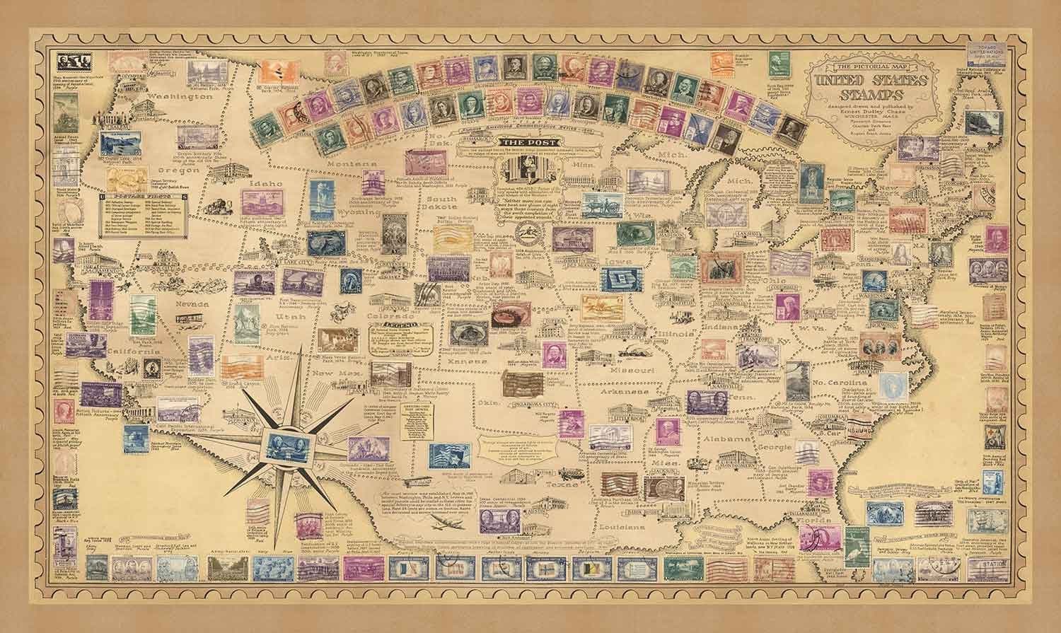 Diese eher einzigartige Karte der Vereinigten Staaten von Amerika, ursprünglich 1949 von Ernest Dudley Chase veröffentlicht, zeigt Dutzende von hochdetaillierten Illustrationen von Briefmarken, hauptsächlich aus den 1930er und 1940er Jahren.