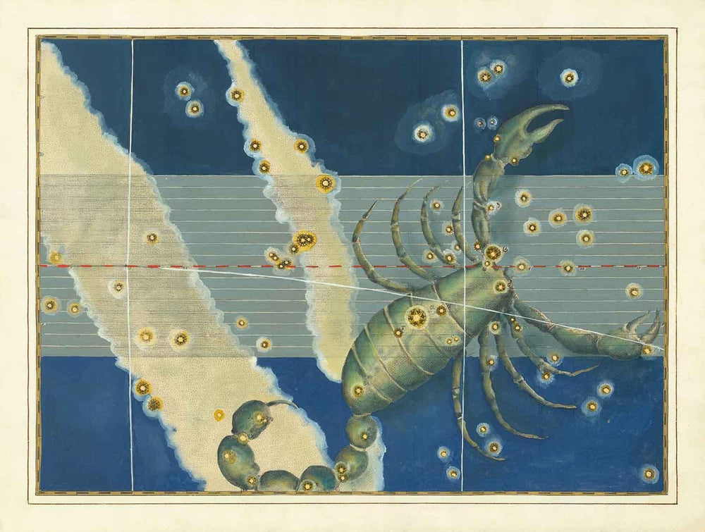Eine atemberaubende und außergewöhnlich seltene handkolorierte Himmelskarte des Tierkreiszeichens Skorpion, Der Skorpion, mit all den Sternen, die in Gold hervorgehoben sind.