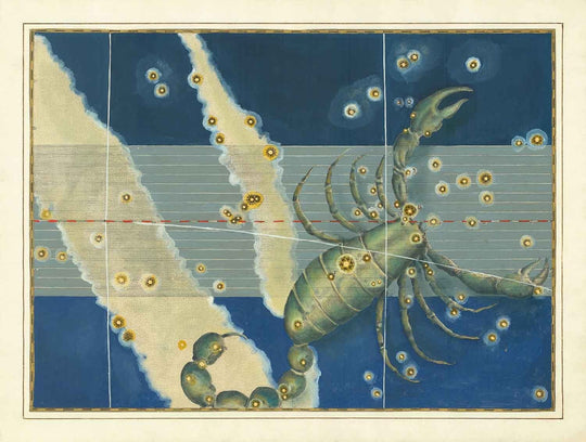 Diese Sternenkarte wurde ursprünglich 1603 in Johann Bayers "Uranometria" veröffentlicht, vielleicht dem einflussreichsten Sternenatlas, der je veröffentlicht wurde, und dem Vorläufer aller modernen Sternenatlanten. Sie enthielt 51 hochgenaue Sternkarten, von denen 48 die ptolemäischen Sternbilder waren. Und natürlich waren die 12 Hauptzeichen des Tierkreises, einschließlich dieses schönen Skorpions, alle enthalten.