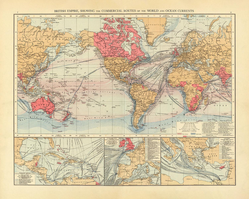 Die Karte ist ein Beweis für die immense Reichweite des Britischen Empire und bietet eine detaillierte Darstellung der Kontinente Europa, Asien, Nordamerika, Südamerika, Afrika und Australien sowie der riesigen Weiten des Pazifiks, des Atlantiks und des Atlantiks Indische Ozeane. Die Handelsrouten sind sorgfältig markiert und zeugen von dem ausgedehnten Netzwerk, das den Austausch von Waren, Ideen und Kulturen auf der ganzen Welt ermöglichte. Die Britischen Inseln, das Herz des Imperiums, sind ebenso hervorzuheben wie die Kolonien in Kanada, Indien, Australien und Neuseeland. Jede dieser Regionen ist mit ihren Großstädten und Häfen dargestellt, den Zentren der Handelsaktivitäten in dieser Zeit.