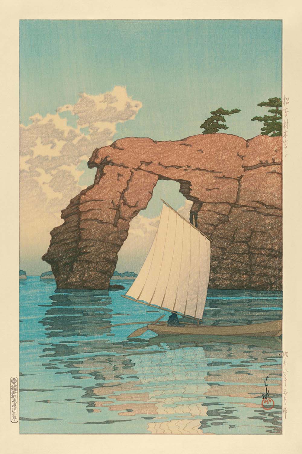 Segelboot und Zaimoku-Insel in Matsushima von Hasui Kawase, 1935