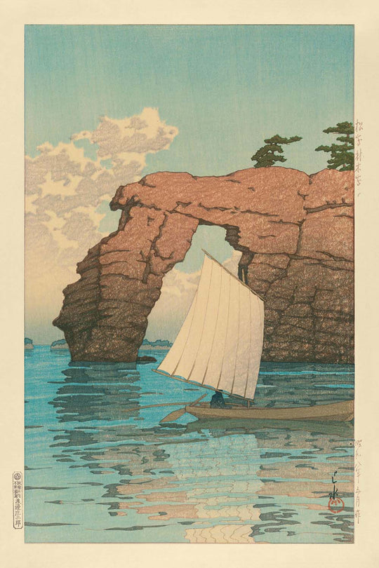 "Segelboot und Zaimoku-Insel in Matsushima" besticht durch seinen meisterhaften Einsatz von Farben; das dominante Blau verleiht dem Stück eine friedliche Aura, während Brauntöne die Komposition verankern und einen auffälligen Kontrast bieten, der die natürliche Schönheit der Insel hervorhebt. Dieser Druck fängt das Wesen von Kawases Vision ein und macht ihn zu einer ansprechenden Ergänzung jeder Sammlung und einem wahren Zeugnis seines Könnens.