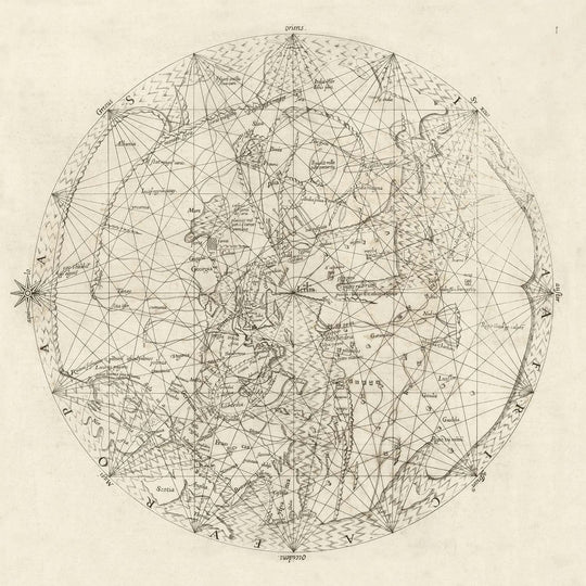 Gestalterisch ist die Karte eine harmonische Mischung aus mittelalterlichen und modernen Elementen. Der Ozean umgibt die bekannten Landmassen, während die äußeren Regionen der Spekulation überlassen sind und den abenteuerlichen Geist der Zeit verkörpern. Die Kompassrose zeigt elegant die Himmelsrichtungen an und führt den Betrachter durch eine Welt, in der Mythos und Realität miteinander verwoben sind. Diese Mappa Mundi ist eine Feier der intellektuellen Neugier der Epoche und fängt die Vorstellungskraft von Entdeckern und Gelehrten gleichermaßen ein.