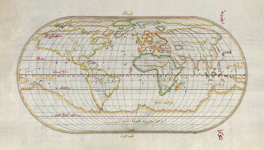 Eine sehr detaillierte ovale Karte, die die Welt mit arabischer Schrift zeigt, zeigt die ganze Welt, wie sie vor fast 500 Jahren gesehen wurde. Die meisten Länder sind genau geformt; jedoch sind die Antarktis, die Ostindien und Westindien noch nicht so gut dokumentiert.