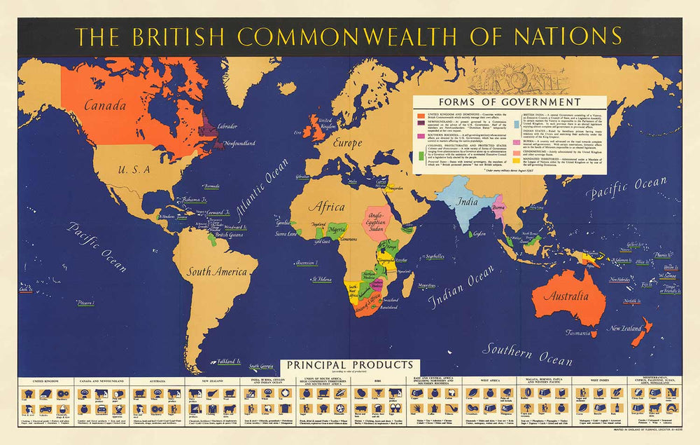 Die Karte zeigt alle "Hauptprodukte", die von jedem der Commonwealth-Nationen hergestellt oder hergestellt werden - wie Maschinen und Zucker in Australien oder Kaffee und Tabak in Ostafrika.