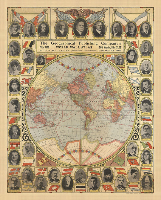 Dies ist eine schöne Flacherdkarte der Welt, umgeben von Porträts von Weltführern zu Beginn des 20. Jahrhunderts.