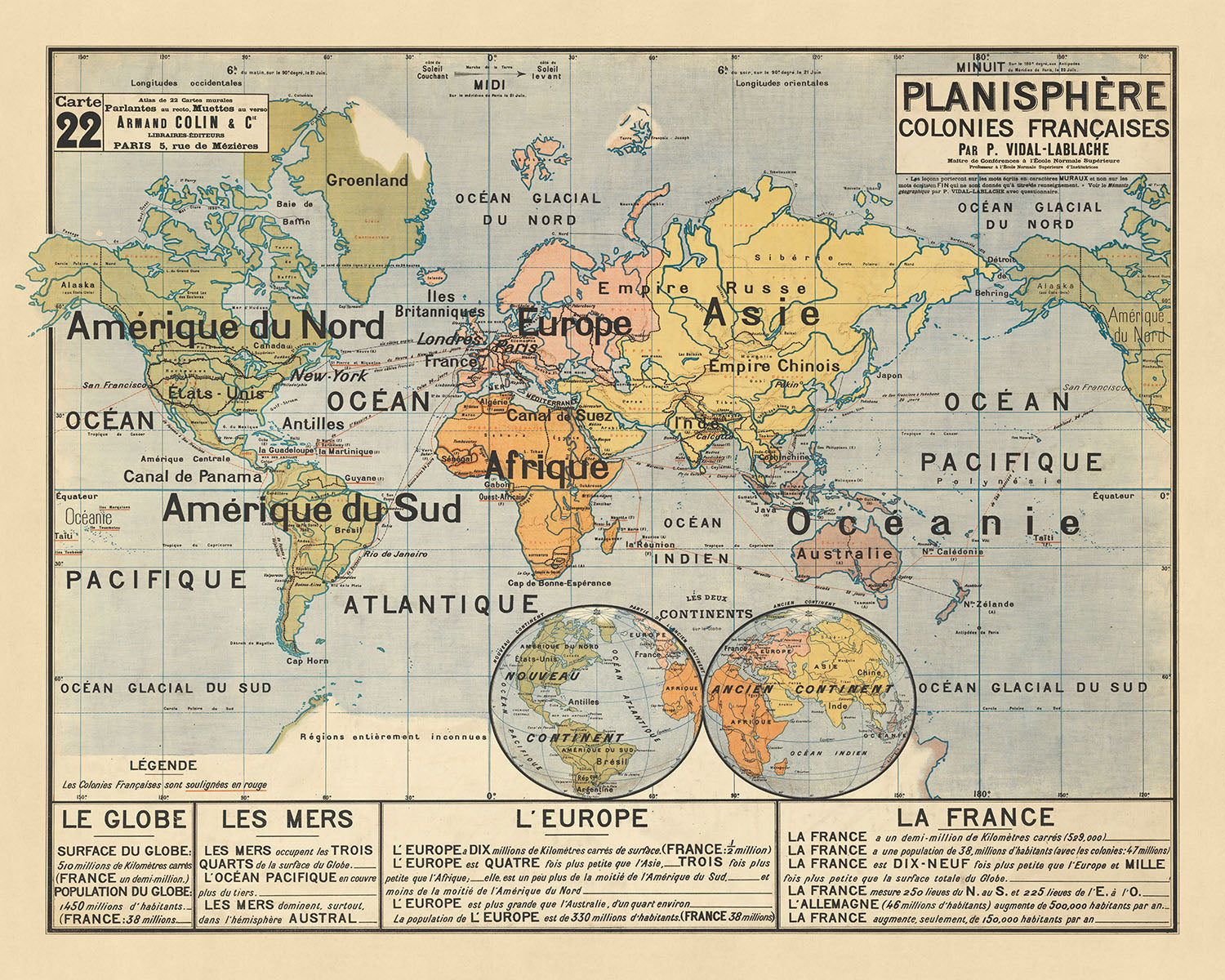 Alte französische Kolonialweltkarte von Vidal Lablache, 1897: Bildungswandkarte
