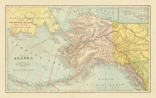 Die Karte zeigt Ihnen alle Alaska in hervorragender Detail, einschließlich der gesamten Reihe von Aleutianischen Inseln. Teile des Yukon (Nordwestkanada) sind gezeigt, die sich auf die Region Klondike konzentrieren. Ostsibirien und die Beringstraße sind ebenfalls deutlich zu sehen. Flüsse, Berge und Siedlungen sind eindeutig markiert. Insbesondere würde Anchorage erst 1912 abgerechnet werden - also ist es nicht auf dieser Karte!