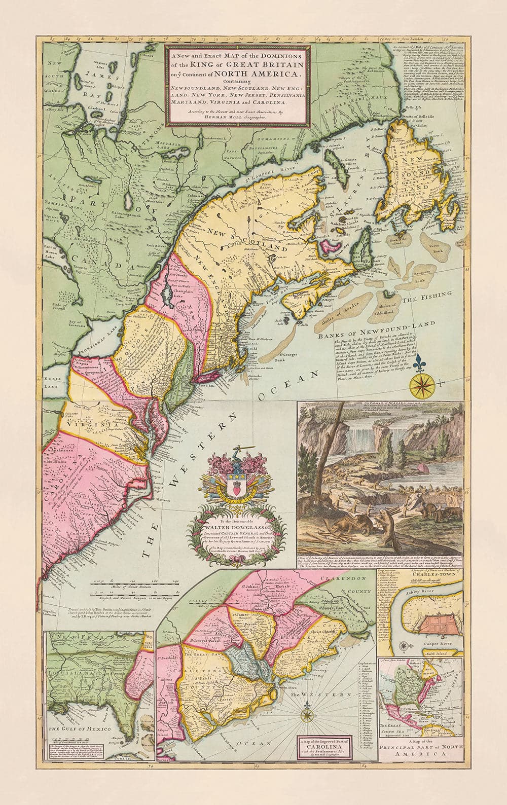 Alte Karte von Nordamerika 1715 von Herman Moll: Neuengland, Neuschottland, New York, Carolina, Französisch & Dreizehn britische Kolonien