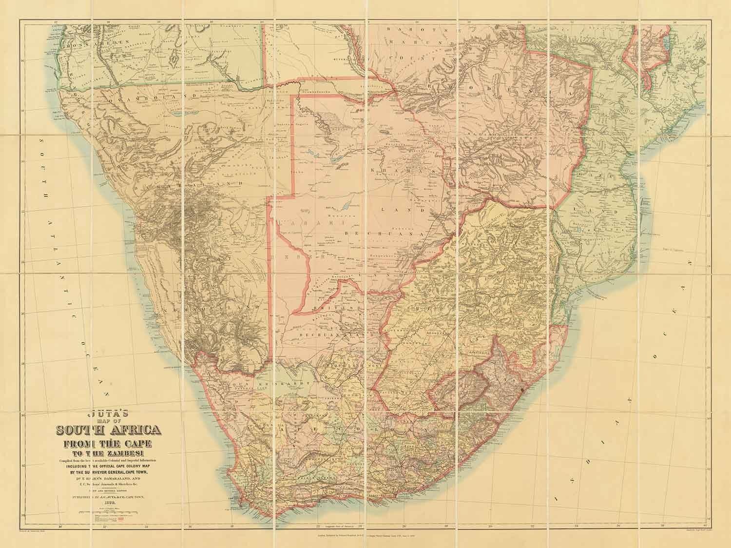 Eine unglaublich detaillierte Karte von Süd- und Zentralafrika, ursprünglich 1899 von Juta and Company in Südafrika und Edward Stanford in London veröffentlicht.