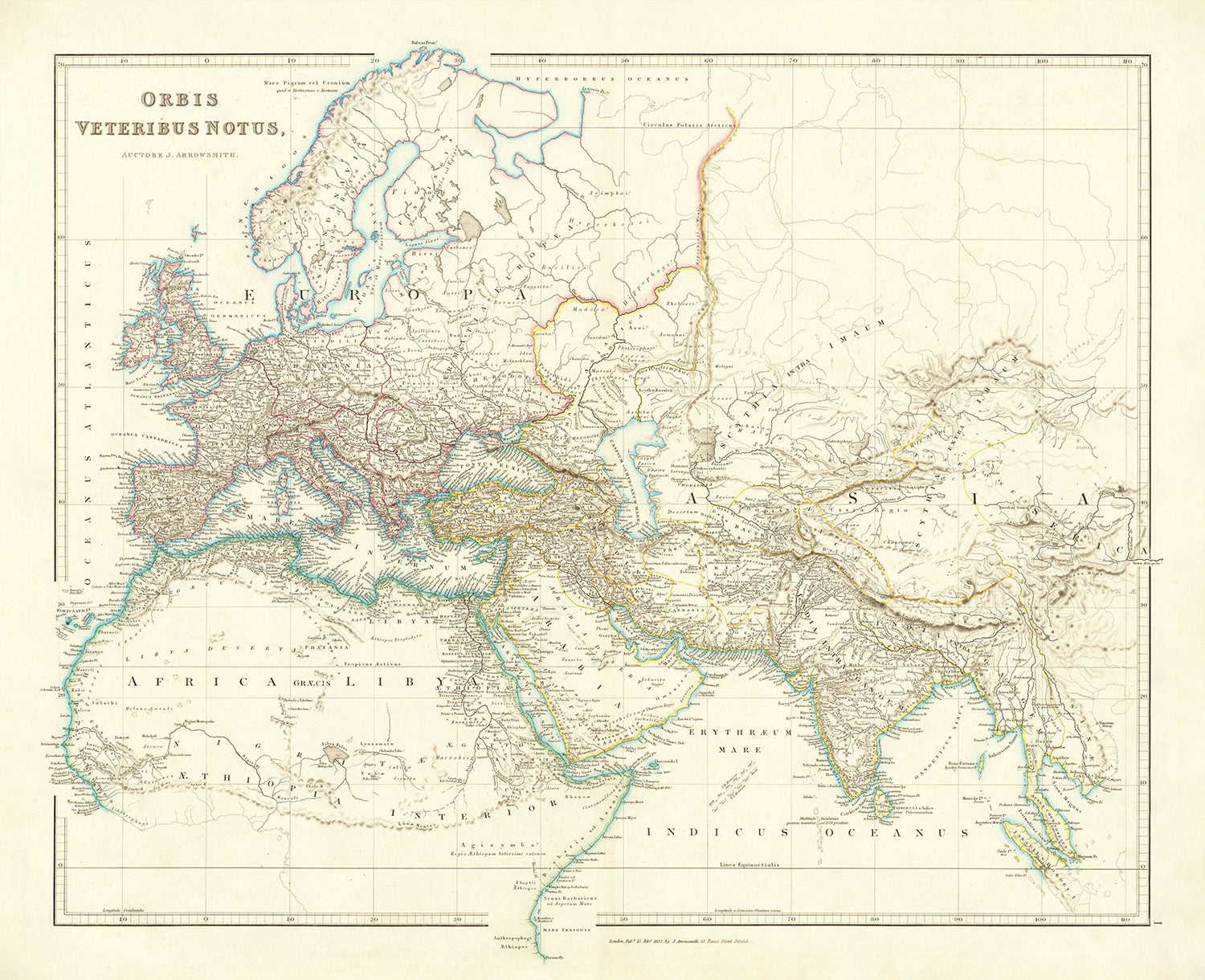 Alte Karte der antiken Welt von Arrowsmith, 1822: Mittelalterliches Europa, Naher Osten, Afrika