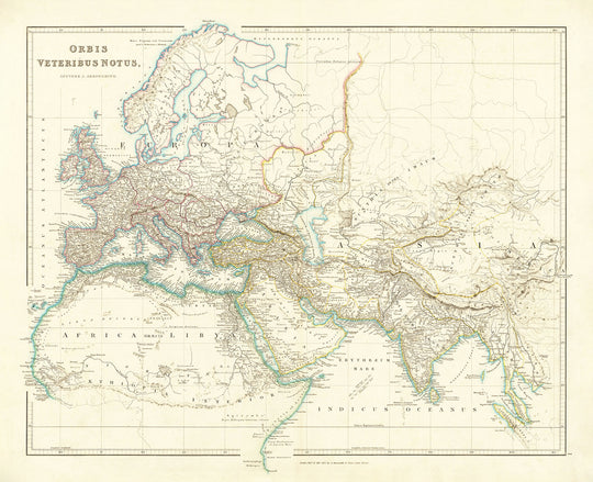 Diese Karte mit dem Titel Orbis Veteribus Notus bedeutet wörtlich "Die der Antike bekannte Welt" oder vielleicht die Alte Welt. Sie zeigt die Teile Europas, Afrikas, Asiens und des Nahen Ostens, die den antiken Zivilisationen bekannt waren - den Römern, den Griechen, den Persern usw.