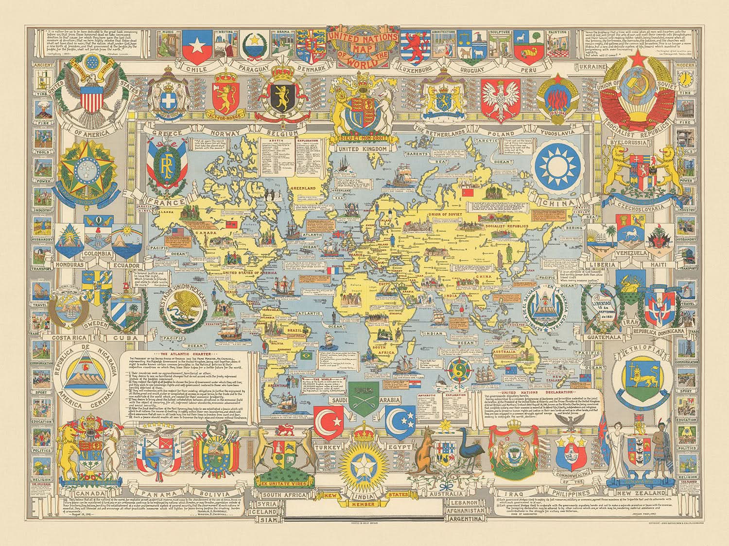 Alte Weltkarte der Vereinten Nationen, 1948: Nach dem Zweiten Weltkrieg, bildliche Darstellung