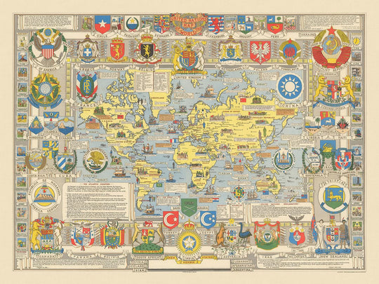 Der thematische und bildliche Stil der Karte ist sowohl ansprechend als auch lehrreich und bietet einen Einblick in die geopolitische Landschaft der späten 1940er Jahre. Der dekorative Rand der Karte, reich an Emblemen und Flaggen, dient als lebendiger Rahmen, der den Blick nach innen auf die detaillierte Darstellung von Ländern und Regionen lenkt. Dieser illustrative Ansatz erhöht nicht nur die visuelle Attraktivität der Karte, sondern bietet auch ein tieferes Verständnis der internationalen Beziehungen und Allianzen dieser Ära.
