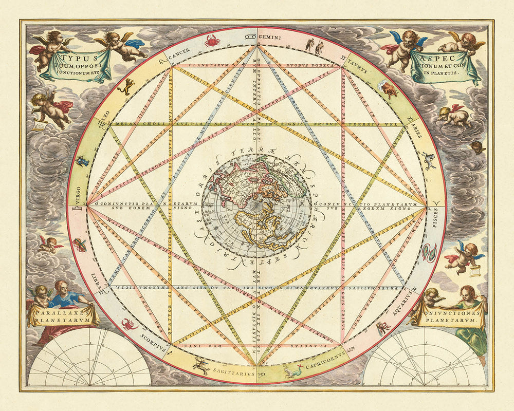 - Enthält eine polare Projektionskarte der Nordhalbkugel im Zentrum, umgeben von einem kreisförmigen Ring von Tierkreiszeichen