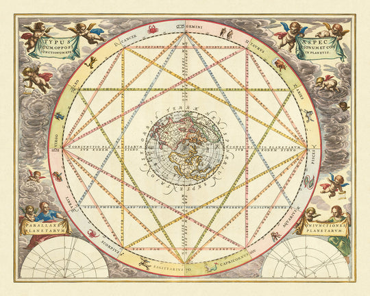 Betreten Sie das goldene Zeitalter der himmlischen Kartographie mit Andreas Cellarius' Meisterwerk, "Typus Aspectuum Oppositionum Et Coniunctionum Etz In Planetis." Geschaffen im Jahr 1660 und später in der angesehenen Ausgabe von Valk & Schenk von 1708 der Harmonia Macrocosmica featured, vereint diese Karte elegant die Bereiche der Astronomie und Astrologie und bietet einen seltenen Einblick in die intellektuellen und künstlerischen Ambitionen des 17. Jahrhunderts. Der ursprüngliche lateinische Titel der Karte signalisiert ihre thematische Tiefe: eine Studie über planetarische Aspekte, Oppositionen und Konjunktionen, wunderschön illustriert durch das Zusammenspiel von zodiakalen Symbolen und den kartierten Himmeln.