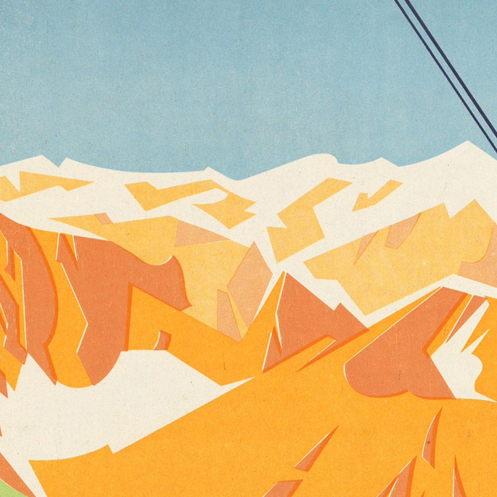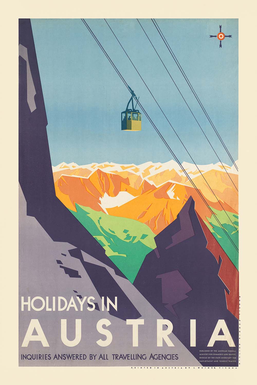 This poster’s subject—holidays in the Austrian high country—speaks to a pivotal moment in European leisure culture. As railways, cable cars, and improved roads opened the Alps to travelers, tourism boards embraced fresh, forward-looking graphics to communicate ease, glamour, and healthy outdoor living. Here, the suggestion of an aerial tramway underscores technological progress, while the monumental mountains evoke a nation defined by its peaks, clean air, and crystalline light.