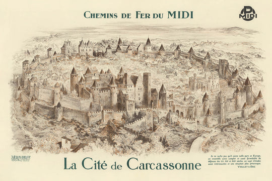 Chemins de fer du Midi. La Cité de Carcassonne by Albert Robida invites you into the legendary medieval fortress of southern France. Created as a travel poster for the railway that served the southwest, this view celebrates the walled citadel high above the Aude. Robida renders a sweeping, bird’s‑eye panorama of concentric ramparts and scores of conical‑roofed towers; a winding road curls up at lower right toward a twin‑towered gate, while the bold green titling anchors the scene on warm, parchment‑beige paper. It’s an evocative tribute to Carcassonne—the fortified city restored in the 19th century and still one of France’s most captivating historic sites.
