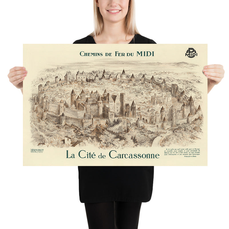 The subject itself is irresistible: La Cité de Carcassonne, with origins in antiquity and mighty defenses expanded through the 12th and 13th centuries, stands as a textbook of medieval fortification. The poster even includes a laudatory remark from the great restorer Eugène Viollet‑le‑Duc, whose 19th‑century work helped fix Carcassonne’s silhouette in the popular imagination. For travelers who have wandered its cobbles or admired it from afar, this image captures the drama of double walls, barbicans, and watchtowers massed above the Aude valley.