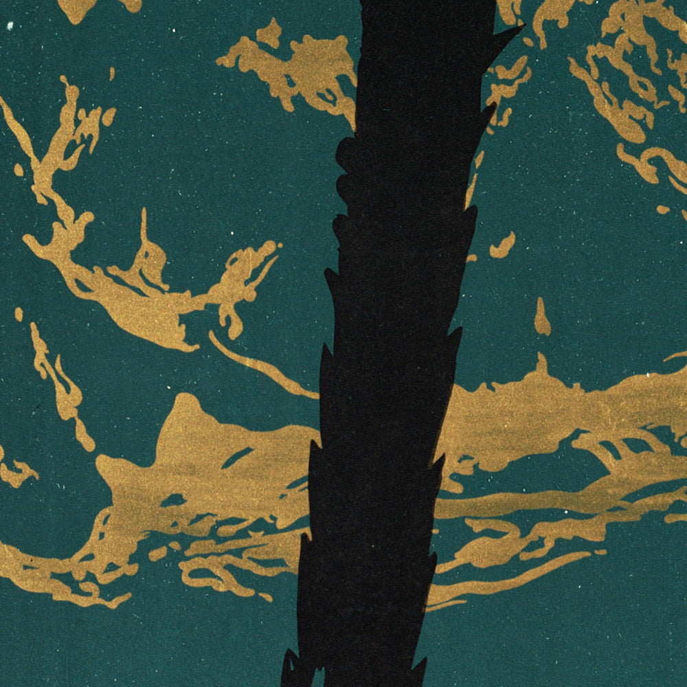 “Caucasus” by N. Zhukov is a classic Intourist travel poster inviting viewers to the storied mountain world between the Black Sea and the Caspian. In a single, cinematic tableau, two inky palm trunks frame snow-capped peaks while a lone horseman rides along a shimmering shoreline. The composition is bathed in deep green with gold highlights—the vertical gold rays that streak behind the mountains are especially striking—capturing the region’s dramatic contrast of subtropical coast and high alpine summits.