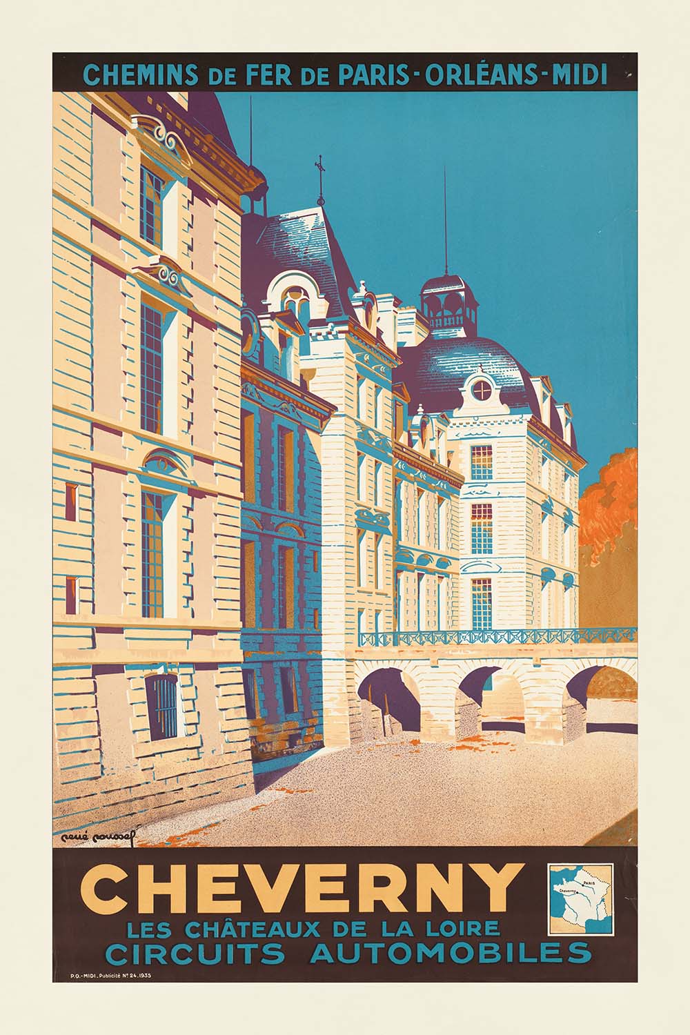 Cheverny. Les Châteaux De La Loire — Circuits Automobiles by René Roussel celebrates one of the Loire Valley’s most elegant estates and the golden age of French touring. The poster centers on the Château de Cheverny’s perfectly symmetrical limestone façade beneath a calm, teal‑blue sky, with warm orange titling that hints at the thrill of setting out by car to explore the region’s storied castles. In a few confident shapes and a refined, travel‑era palette, Roussel evokes the tranquil grandeur and sunny charm that make the Loire so beloved.