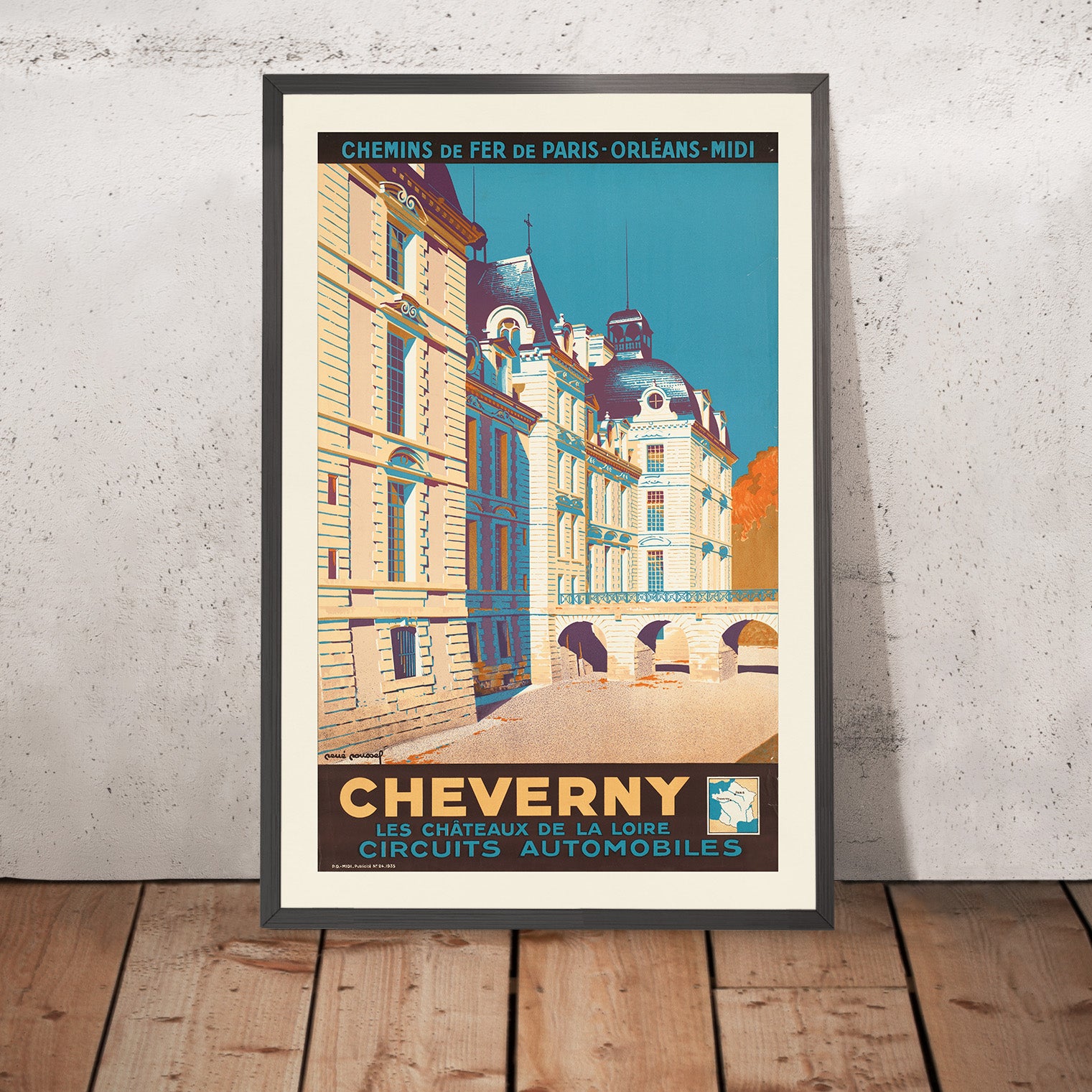 Design lovers will appreciate the poster’s sophisticated balance of color and form: soft beige stone warmed by sunlight, the serene blue‑green of the sky, and a punch of orange that anchors the composition and typography. The clean symmetry of Cheverny’s façade and the rhythm of windows and dormers make a timeless focal point for interiors, pairing effortlessly with neutral schemes or adding a refined accent to bolder rooms. This is an ideal print for anyone who loves French heritage, classic motoring romance, or the poised elegance of mid‑century travel graphics.