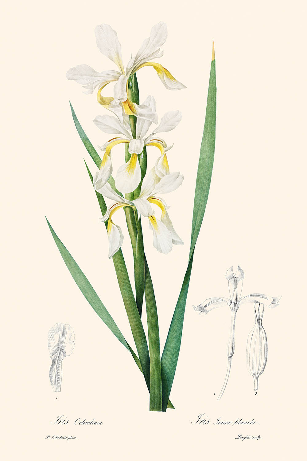 "Gold-Banded Iris" hebt sich nicht nur durch seine wissenschaftliche Genauigkeit hervor, sondern auch durch seine künstlerische Eleganz. Redoutés Verwendung von sanften, harmonischen Farben und präzisen Linien bringt die komplizierte Schönheit der Iris zur Geltung und macht sie zu einem fesselnden Stück für jeden Kunstliebhaber. Die subtilen Abstufungen von Gelb und Weiß vor dem reichen grünen Hintergrund heben die natürliche Schönheit der Blume hervor und machen sie zu einem zeitlosen Stück für jede Wohn- oder Büromöblierung.