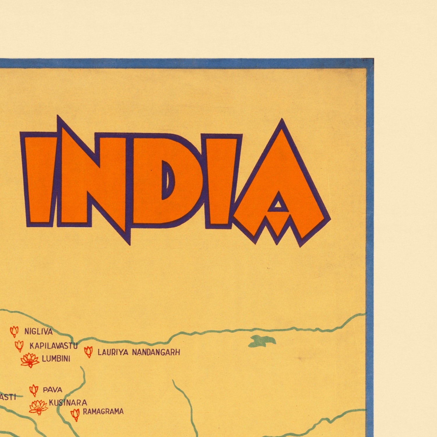 Why this poster matters: the title India. The land of Lord Buddha underscores the country’s global significance as the cradle of Buddhism, and the artwork likely served to orient travelers toward places of pilgrimage and learning. Produced during an era of heightened international curiosity about India’s ancient sites, the poster functions both as handsome wall art and as a historical artifact of early tourism marketing—when modern graphic design met cultural storytelling to inspire long-distance journeys.