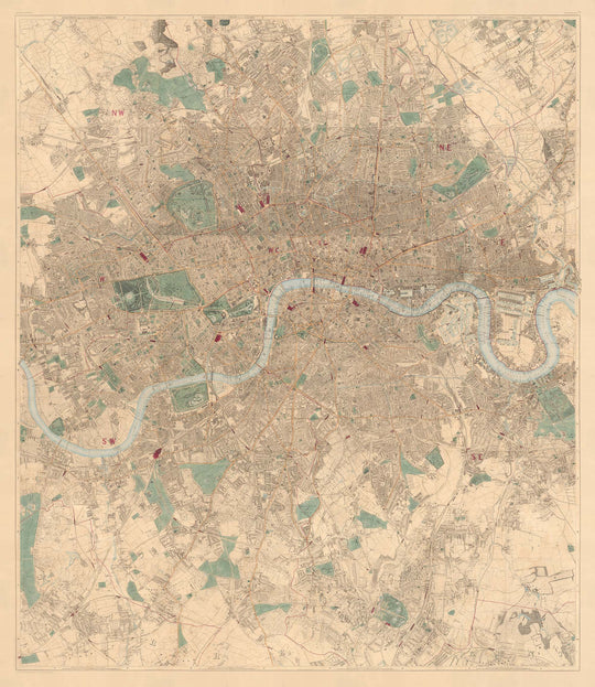 Ursprünglich in 24 Blättern gedruckt, ist dies die detaillierteste alte Londonkarte, die Sie finden können. Fast jede einzelne Wohnung in London ist auf dieser Karte eingezeichnet - und wenn man bedenkt, dass in den 1860er Jahren etwa 3 Millionen Menschen in London lebten, sind das eine Menge Wohnungen.
