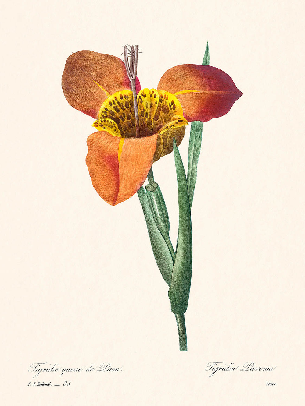 Dieses Kunstwerk, die Mexikanische Muschel, exemplifiziert Redoutés außergewöhnliches Talent, die feinen Details und lebendigen Farben botanischer Exemplare darzustellen. Der viktorianische Stil der botanischen Illustration kombiniert wissenschaftliche Genauigkeit mit künstlerischer Schönheit, was es zu einem geschätzten Stück für Kunstliebhaber und botanische Enthusiasten macht.