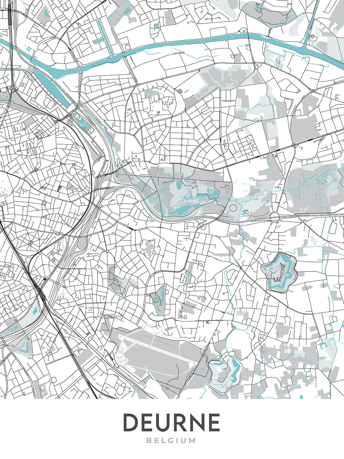Moderne Stadtkarte von Deurne, Belgien: Rathaus, Rivierenhof Park, Luchtbal Sportkomplex, A12, N13