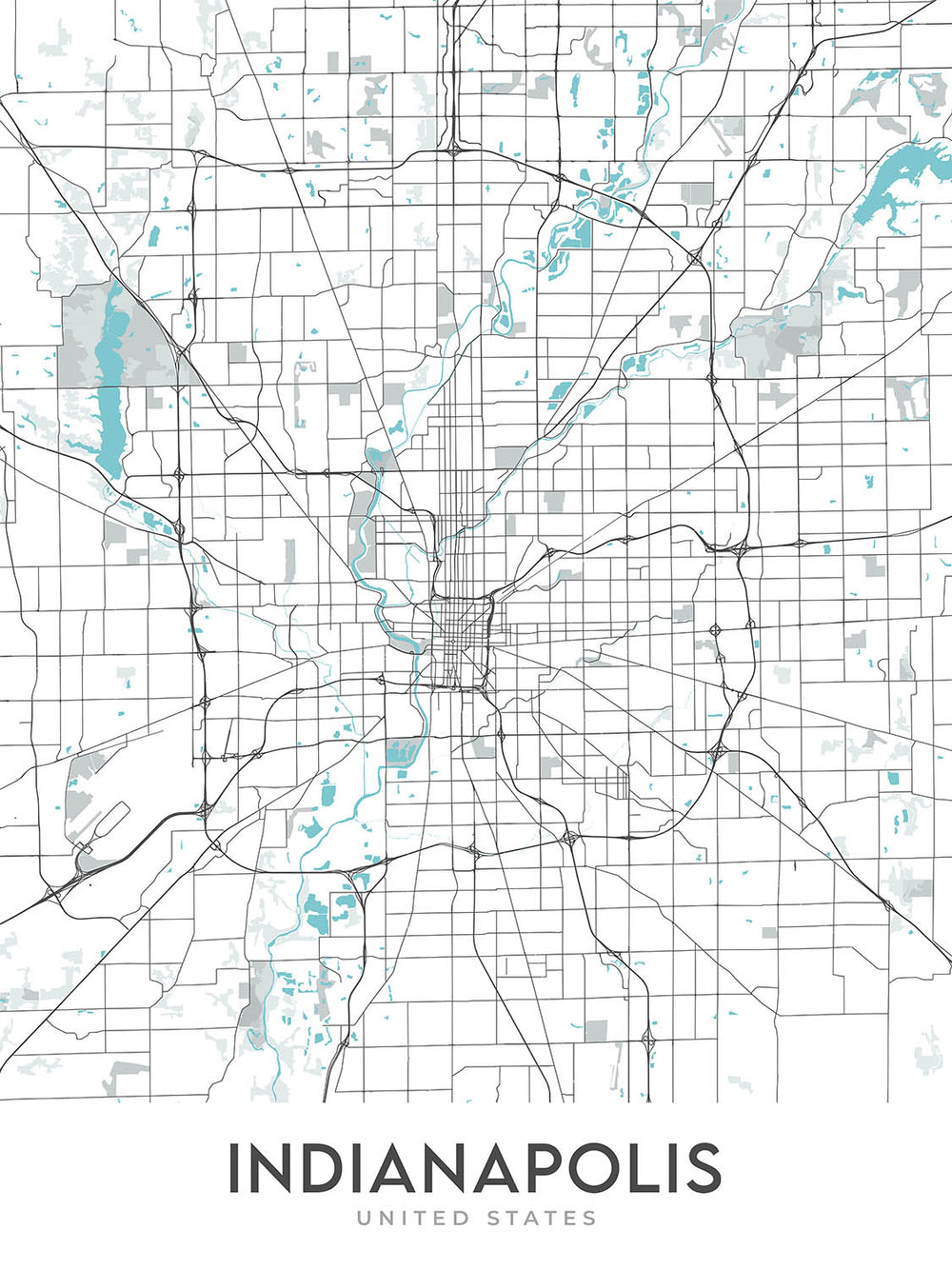 Diese Karte von Indianapolis, Indiana, ist eine moderne, detaillierte Straßenkarte ohne Beschriftung. Die Karte konzentriert sich auf die Stadt Indianapolis und ihre umliegenden Gebiete und bietet eine genaue und optisch ansprechende Darstellung des Stadtgrundrisses. Die Karte deckt ein rechteckiges Gebiet ab, das sich etwa 25 Meilen von Nord nach Süd und 21 Meilen von Ost nach West erstreckt und verschiedene Stadtteile, Städte, Hauptstraßen und Sehenswürdigkeiten umfasst.