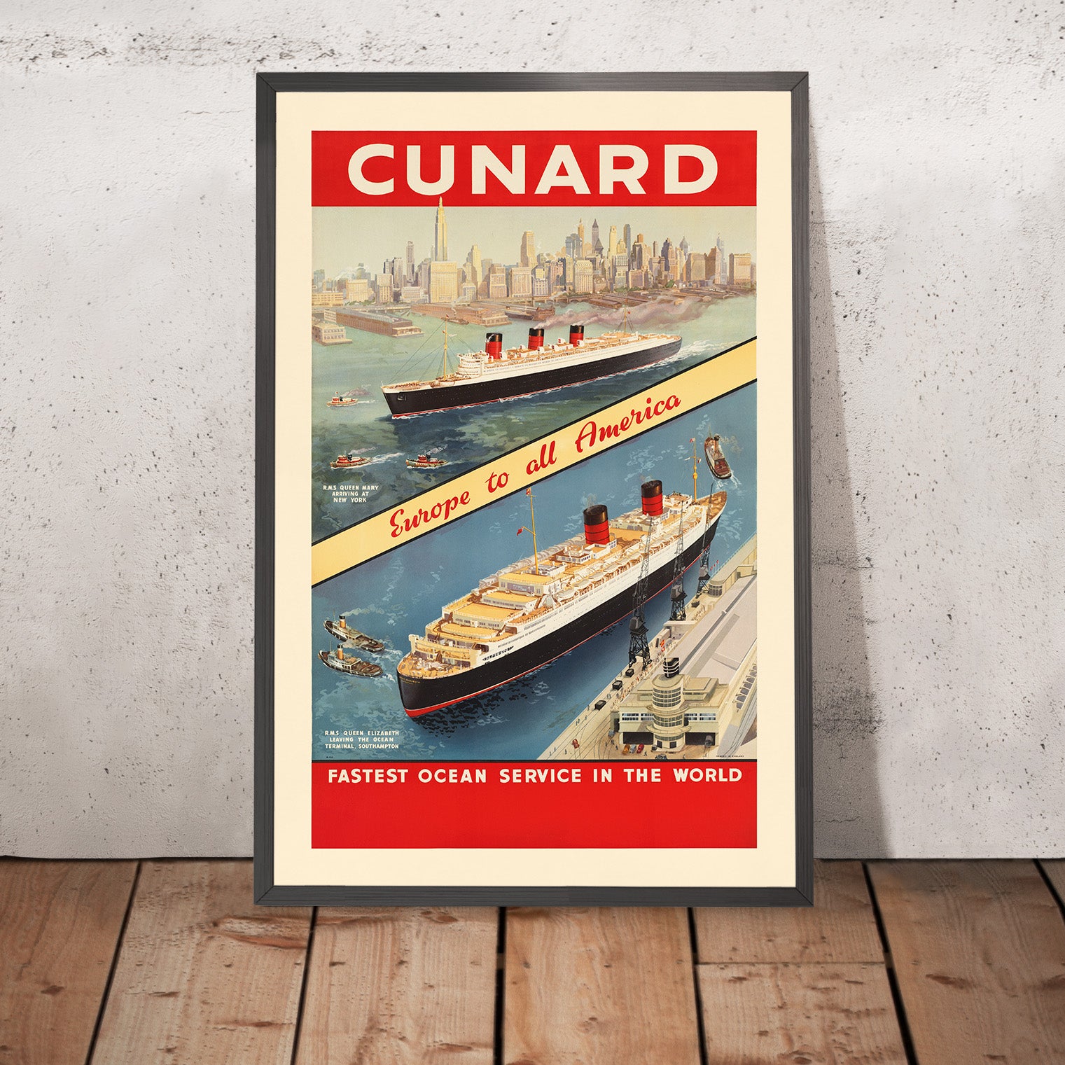 The subject is historically notable. This poster celebrates the celebrated Europe–America route that linked Southampton with New York, the world’s most storied ocean crossing. By featuring the Queen Mary and the Queen Elizabeth—liners synonymous with mid‑century travel—it distills the golden age of steamship travel into a single image. For anyone with ties to New York, to Southampton, or to transatlantic history, the geography is front and center.