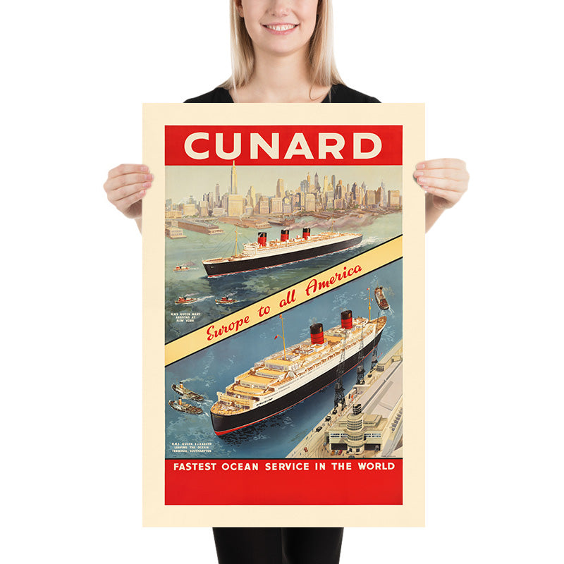 Cunard. Fastest ocean service in the world is a classic mid‑century travel poster created for the famed British shipping company’s transatlantic services. The original artist is unknown, but the work captures two celebrated liners in action: “R.M.S. Queen Mary arriving at New York” across the upper panel, and “R.M.S. Queen Elizabeth leaving the Ocean Terminal, Southampton” below—both captions appear on the poster. A cream diagonal ribbon reading “Europe to all America” slices dynamically across ocean blues, while a bold red header proclaims CUNARD and a matching footer declares the famous tagline. The composition’s crisp skyline of New York and the streamlined Southampton terminal anchor the romance of an Atlantic crossing at the height of ocean‑liner glamour.