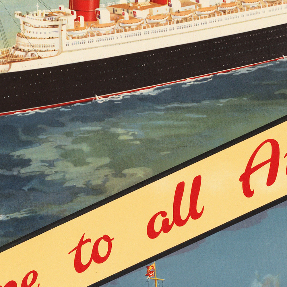 About the maker behind the image: the publisher was the Cunard Line, founded in 1840 and long headquartered in Liverpool and later Southampton. Cunard’s publicity office collaborated with leading British lithographic studios and commercial illustrators, commissioning posters that conveyed speed, safety, and cosmopolitan style. The company’s iconic house colors—deep black hulls and red‑and‑black funnels—became visual shorthand for swift service across the North Atlantic.
