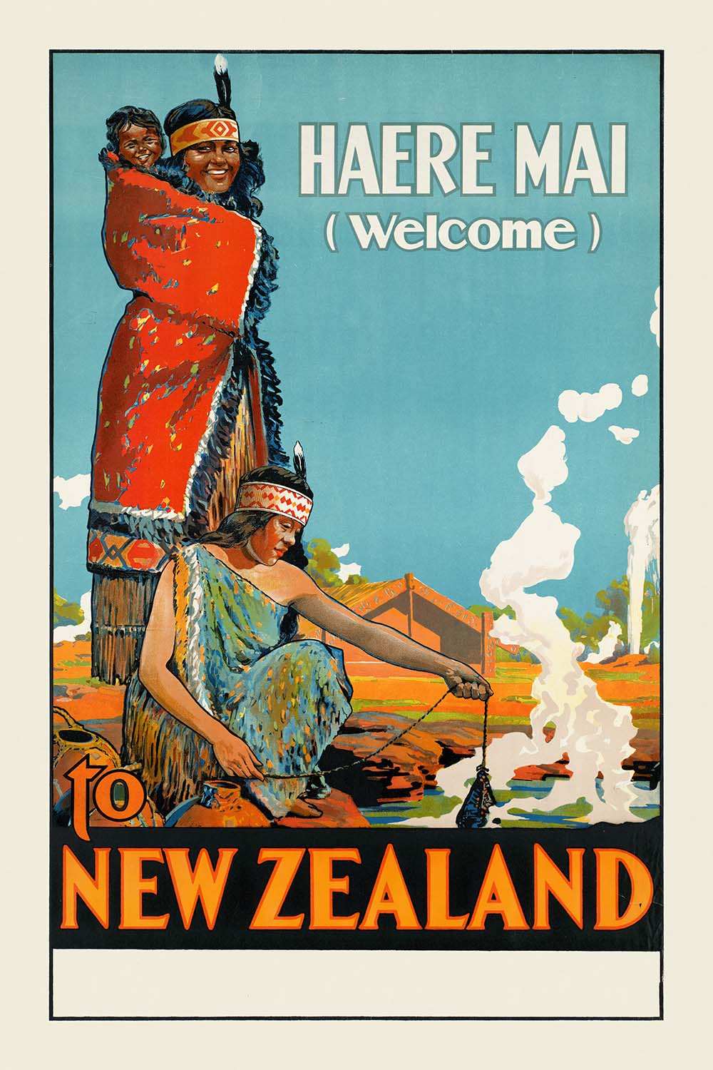 The subject is New Zealand at the very moment it was stepping confidently onto the global tourism stage. In that era of ocean liners and expanding air routes, the poster’s positioning of Māori motifs and language signaled both cultural richness and a uniquely Pacific welcome. More than simple promotion, it helped shape how international audiences imagined New Zealand—an interplay of majestic landscapes and living indigenous heritage.