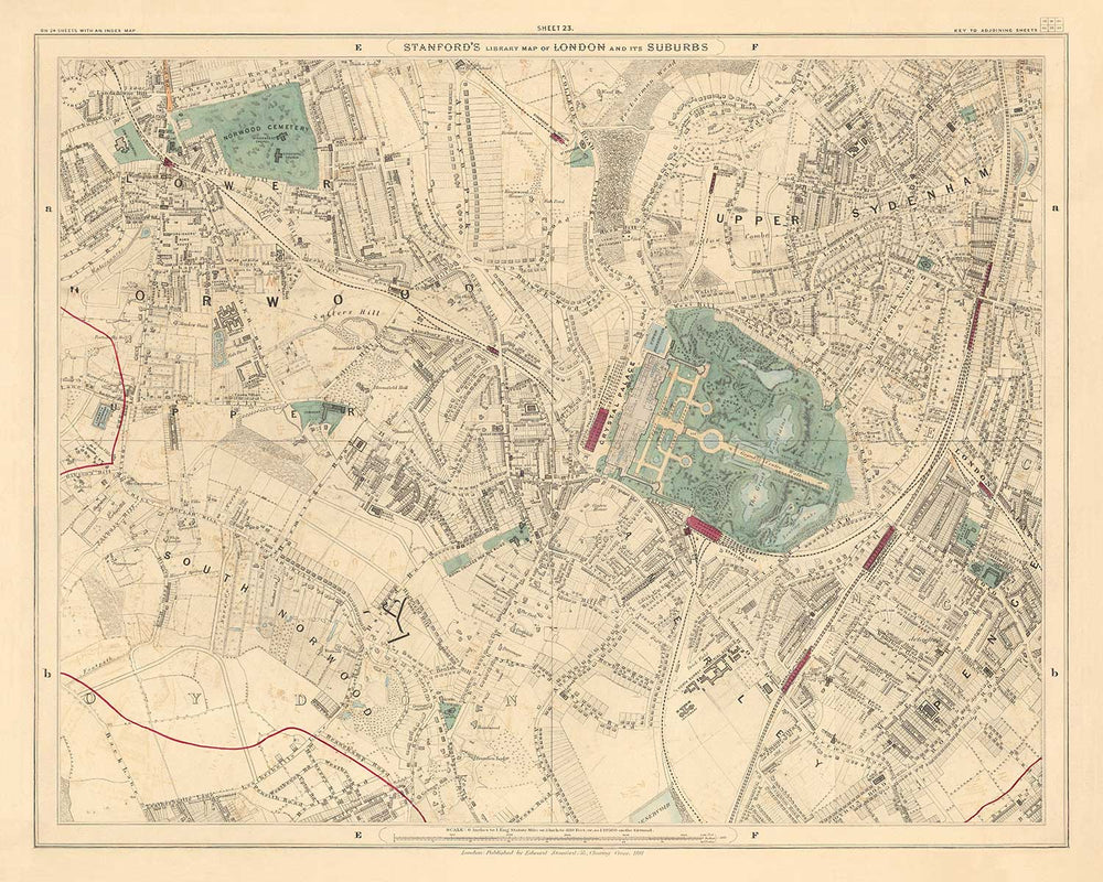 Die Karte wurde ursprünglich in 24 Blättern veröffentlicht. Insgesamt hätte die Karte etwa 2 Meter breit (78 Zoll) gemessen. Dies hier ist Blatt 23, das sich auf die südöstlichen Londoner Stadtteile Croydon, Bromley, Lambeth, Lewisham und Southwark konzentriert.