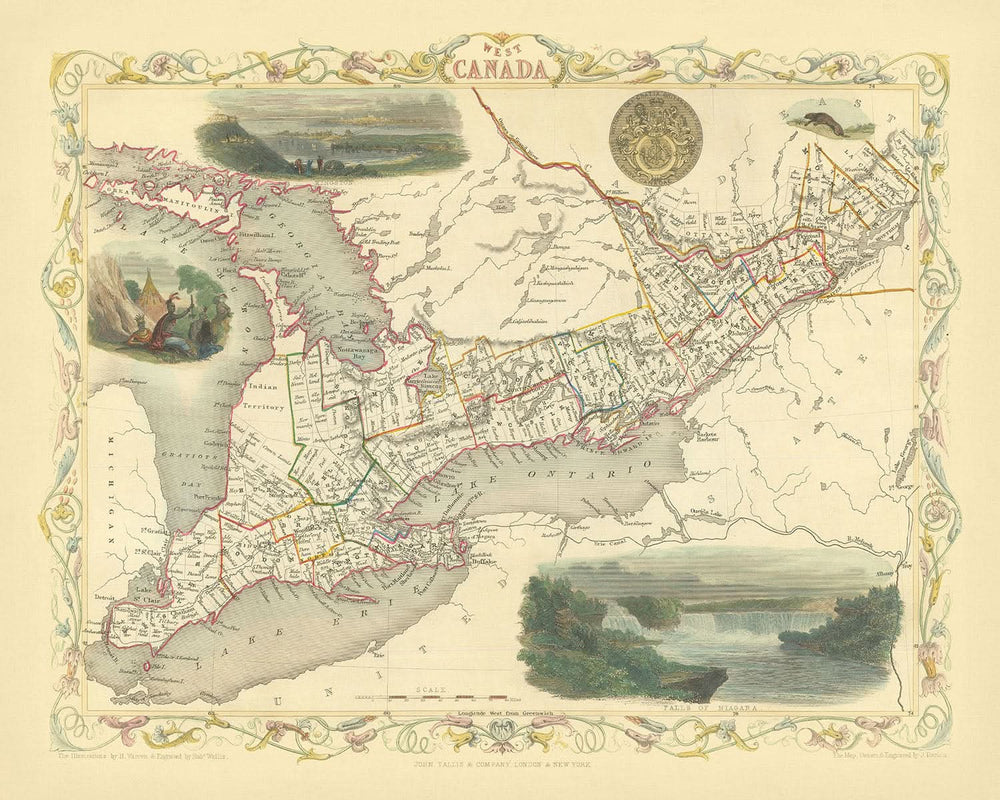Entdecken Sie den faszinierenden Reiz von „West Canada“, einer exquisiten Karte, die 1851 vom berühmten Kartografen John Tallis angefertigt wurde. Tallis war für seine aufwendigen Entwürfe und sein künstlerisches Flair bekannt und einer der letzten großen dekorativen Kartografen. Seine Arbeit wird für ihre detaillierten Vignetten und ornamentalen Ränder gefeiert, die das Wesen der abgebildeten Regionen einfangen. Diese Karte, die in R. Montgomery Martins Illustrated Atlas abgebildet ist, ist ein Beweis für Tallis‘ Hingabe, kartografische Präzision mit künstlerischer Schönheit zu verbinden.