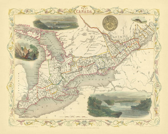 Alte Karte von 'Westkanada' von Tallis, 1851: Toronto, Niagarafälle, Eriesee, Kingston, Vignetten