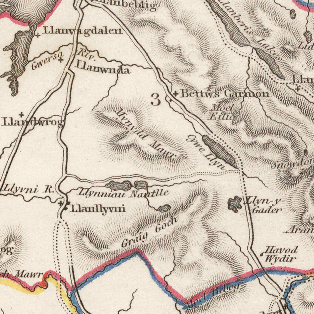 The interior is dominated by the Eryri massif, its ridges and cwms carved into relief by fine hachures that convey both drama and direction. Llanberis sits cradled between Llyn Padarn and Llyn Peris, at the foot of Yr Wyddfa (Snowdon), with valleys draining by the Seiont to Caernarfon and by the Glaslyn toward Porthmadog. Here the burgeoning slate economy announces itself in routes converging on Blaenau Ffestiniog, their alignment toward the coast underscoring industry’s pull. Early railways—most notably the pioneering narrow-gauge line carrying slate to Porthmadog—appear within a web of turnpikes, bridges, and rivers, illustrating how Victorian infrastructure began to tame the highland distances without diminishing the landscape’s rugged character.