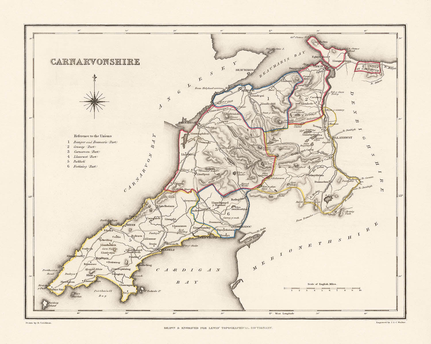 To the southwest, the Llŷn Peninsula stretches out, its low, windswept spine dotted with market towns and harbors, including Abersoch and Porthmadog, and further south the shore-line town of Harlech stands sentinel above Tremadog Bay. The map’s color-keyed administrative boundaries make immediate sense of the county’s internal order, while a reference table deciphers the Poor Law Unions that reorganized local governance in the 1830s and 1840s. These Unions—groupings of parishes around hubs such as Bangor, Caernarfon, Conway, Pwllheli, and Ffestiniog—reveal a county calibrated to social care as well as to trade. Canals and bridges are neatly annotated, linking quarries, farms, and ports into a single economy readable from coast to crest.