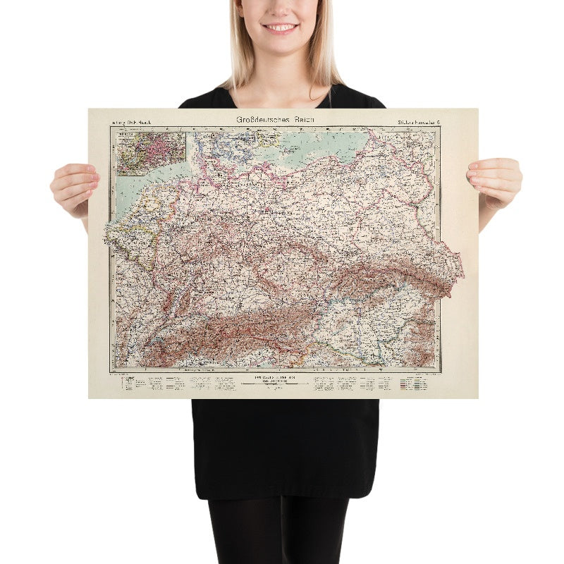Grossdeutsches Reich is the stark and resonant title of this late-war sheet from the storied Stieler tradition, a meticulously engraved view of Central and Eastern Europe at the very brink of epochal change. Prepared in 1944 and issued in the final months of World War II, it marries outline color with crisp blue-ink indexing to clarify an otherwise tangled political landscape. Relief is rendered through disciplined hachures, giving mountain chains, river valleys, and uplands a tactile presence that anchors the map’s political assertions in palpable terrain. An inset of Berlin in the upper left concentrates attention on the Reich’s beating heart, while the main field unfurls a dense web of borders, routes, and place-names whose precision belies the turmoil they record.